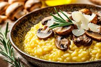 Goldgelbe Risottokreation, verfeinert mit zarten Pilzen und frischem Rosmarin, hebt den Genuss feiner Aromen hervor. Darauf schmelzende Parmesanspäne verleihen dem Gericht das gewisse Etwas. Diese appetitliche Komposition bringt italienisches Flair und Wohlfühlatmosphäre in jede moderne Küche und macht sie zum perfekten Hingucker.