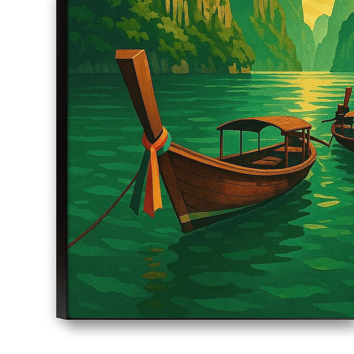 Dieses Kunstwerk zeigt die dramatische natürliche Schönheit von Koh Phi Phi, einer der berühmtesten Inselgruppen Thailands. Die Komposition zeigt zwei traditionelle Longtailboote, die sanft auf dem smaragdgrünen Wasser ruhen, eingerahmt von hoch aufragenden Kalksteinklippen, die sich zu beiden Seiten mächtig erheben. Der Sonnenaufgang bricht hinter den Klippen hervor und wirft goldene Strahlen, die sich über den Himmel ausbreiten und auf der Meeresoberfläche reflektieren.