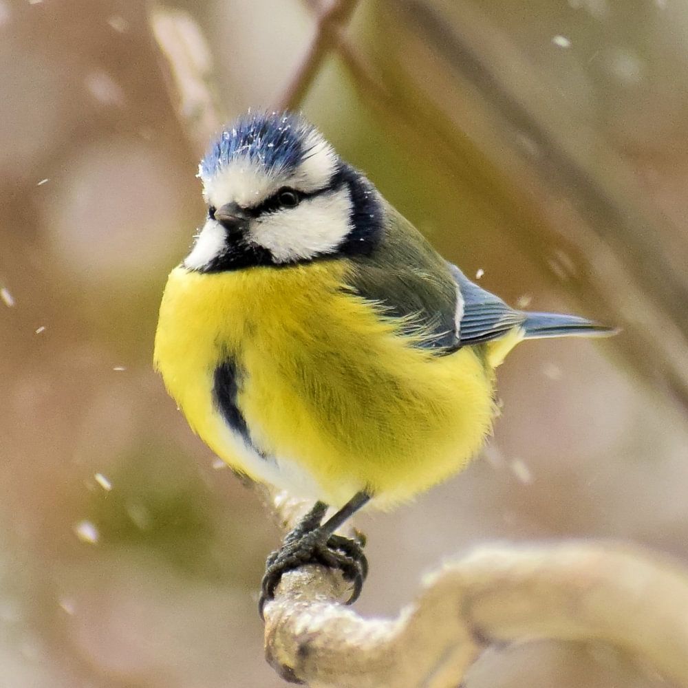 Eine Kohlmeise sitzt auf einem Ast und schaut in die Kamera, während es leicht schneit. Er wollte von ein paar Erdnüssen essen, schaute sich aber erst einmal in Ruhe um.