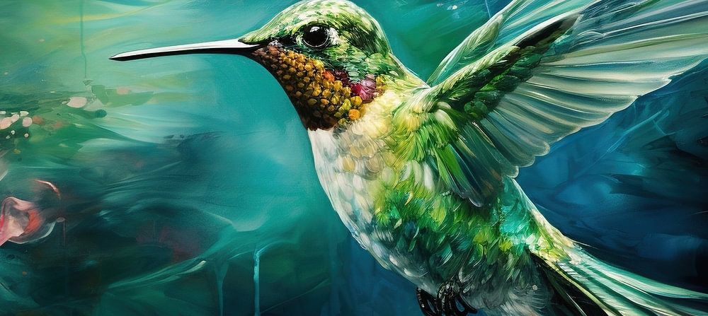 Hummingbird Artwork Blue - Dieses dynamische Gemälde fängt die Essenz eines Kolibris im Flug ein, wunderschön dargestellt mit einem energischen Pinselstrich und lebendigem, impressionistischem Flair. Der Hintergrund ist in eine verträumte Mischung aus kühlen Blau- und Grüntönen gehüllt, die den Fokus - den Vogel und die Blüte - mit ihren warmen Orange- und Rottönen kontrastieren und der Szene eine besondere Tiefe und Bewegung verleihen.
