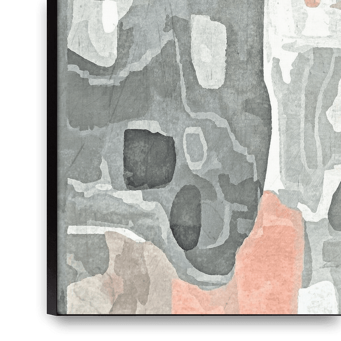 Die Komposition in Grautönen und Terrakotta ist ein abstraktes Werk. Sie besteht aus Formen und Linien und wurde ohne KI hergestellt.