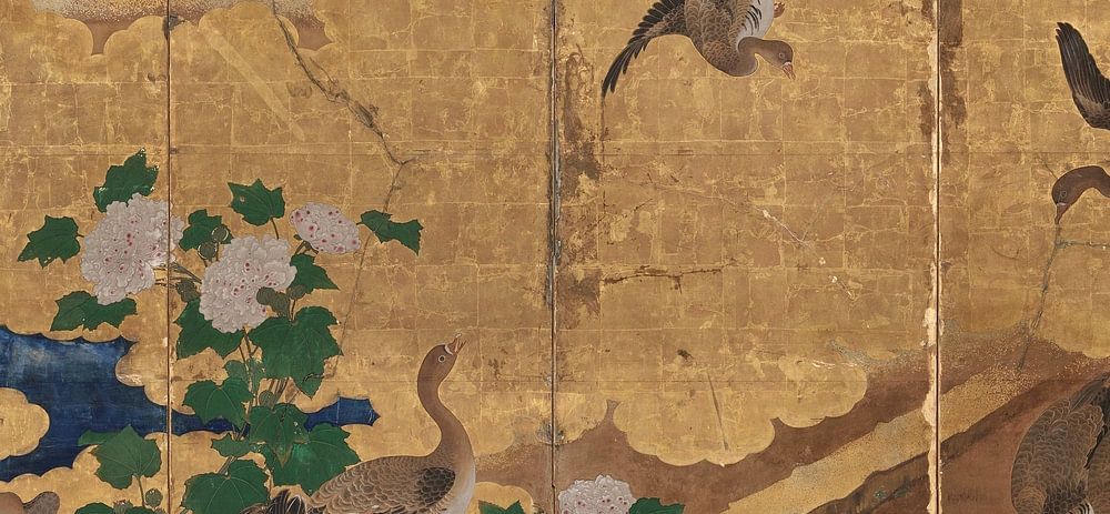 Es handelt sich um ein Paar sechsteilige Paravents, die das Tokugawa-Shogunat von Japan dem König von Joseon schenkte, als sie 1748 als diplomatische Gesandte entsandt wurden. Die auf dem Paravent dargestellten Gänse und Lotosblumen sind eher dekorativ als naturgetreu