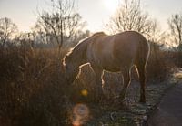 Nahaufnahme eines Konik-Pferdes bei Meinerswijk, Arnheim, Gelderland, im Sonnenlicht der aufgehenden Wintersonne, was einen schönen Linsenreflex verursacht