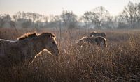 Landschaft in Meinerswijk, Arnheim, Gelderland, wo die Konik-Pferde an einem sonnigen Wintermorgen im trockenen Gras stehen