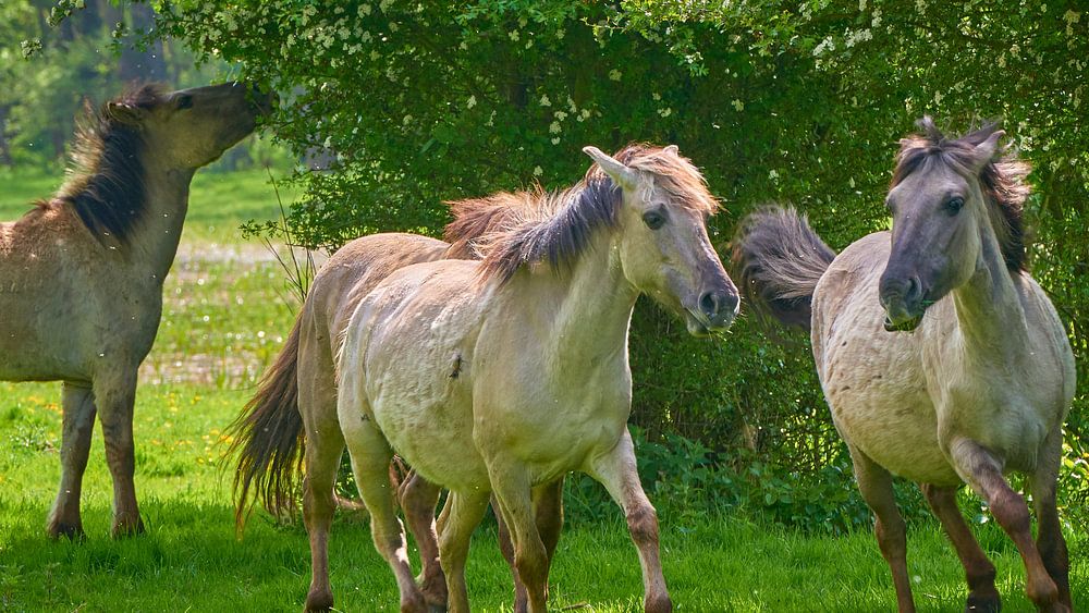 Konik-Pferde laufen in der Frühlingssonne in der Horsterwold.