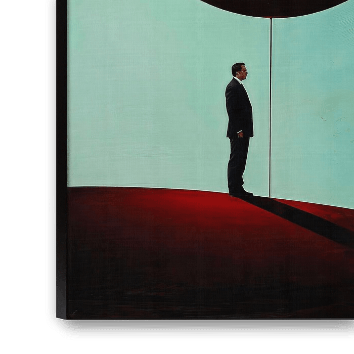Surreale Landschaft, die von geometrischen Formen und kontrastierenden Farben dominiert wird. Metaphorische Darstellung, die auf Konzepte wie Perspektive, Verbindung oder die menschliche Verfassung anspielt. Das Gemälde ruft ein Gefühl von Mysterium und Kontemplation hervor. Seine leuchtenden Farben und starken Kontraste schaffen eine visuell fesselnde Komposition, die den Betrachter dazu anregt, über die Beziehungen zwischen seinen verschiedenen Elementen und ihre möglichen Bedeutungen nachzudenken.