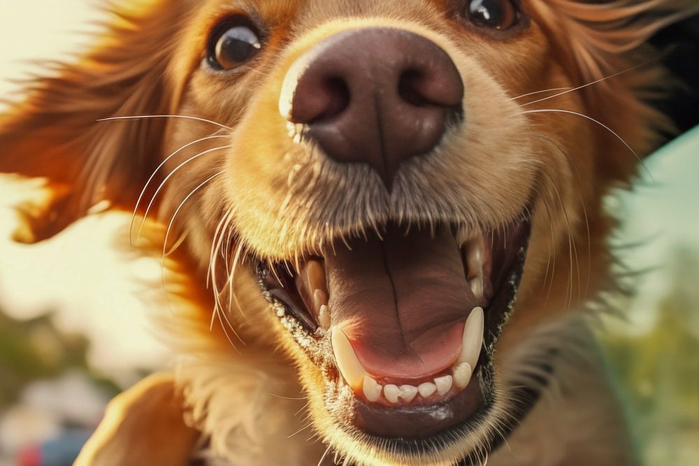 Kopf eines glücklichen Schoßhundes, der aus dem Autofenster schaut.