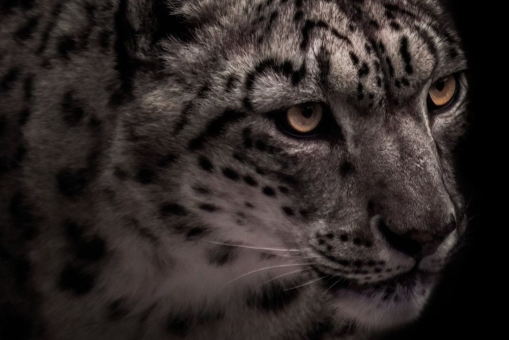 Kopf eines schönen Schneeleoparden mit klaren Augen auf schwarzem Hintergrund, schwarz-weißes Wintertier.