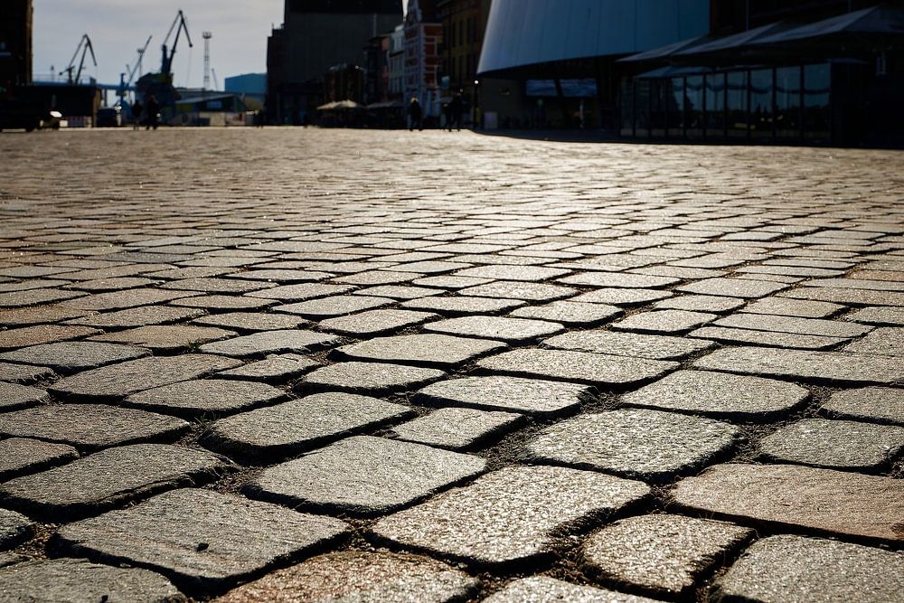 Kopfsteinpflaster der Uferpromenade im Gegenlicht bei Sonnenuntergang im Hafen von Stralsund in Deutschland