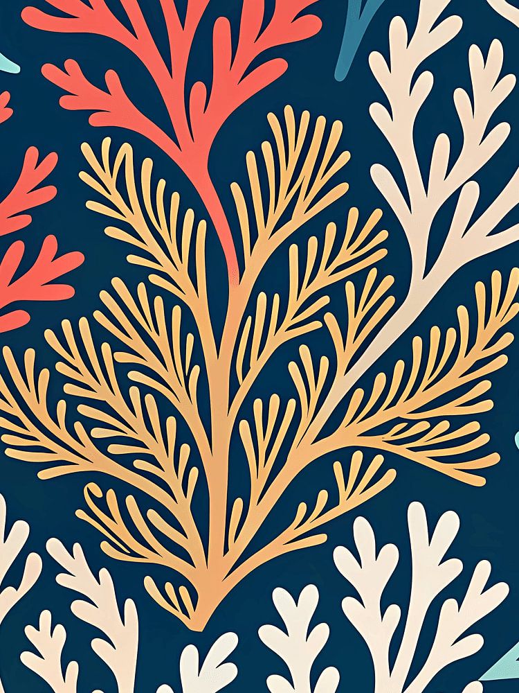 Eine lebendige, abstrakte Darstellung von Korallen mit einer dynamischen Anordnung von verzweigten Formen in einer reichen Farbpalette. Dieses Werk erinnert an die Schönheit und Vielfalt der Unterwasserwelt.