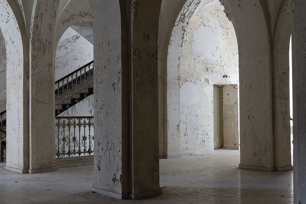 Korridor in einem verfallenen Jesuitenkloster mit Bögen und Treppenhaus. Valkenburg, Limburg, Niederlande. Urbex.