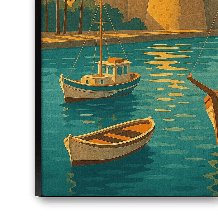 Dieses Art-déco-Plakat von Kos zeigt die Schönheit des Hafens der Insel, wo sich historische Burgmauern über das ruhige Wasser der Ägäis erheben. Helle Segelboote schwimmen anmutig und reflektieren den sonnenbeschienenen Himmel in warmen Gold- und Türkistönen. Die Kunstwerke sind im zeitlosen Stil alter Reiseplakate gestaltet, wobei kühne Lichtstrahlen sowohl Dramatik als auch Nostalgie vermitteln. Kos, ein Juwel des Dodekanes, ist bekannt für seine reiche Geschichte, seine pulsierende Strandpromenade und seinen mediterranen Charme - all das wurde hier in einer harmonischen Komposition eingefangen. Die geometrischen Linien und die stilisierten Farbtöne verleihen dem Bild einen Hauch von Eleganz und machen es zu einem perfekten Dekorationsstück für von der Küste inspirierte Innenräume oder Kunstsammlungen. Dieses Kos-Poster ist ideal für Griechenland-Liebhaber, Reisende auf der Suche nach Inselerinnerungen oder alle, die sich von der Romantik des Meeres angezogen fühlen, und erfüllt Ihren Raum mit der Wärme und dem Licht der Ägäis. Ein beeindruckendes Kunstwerk, das Geschichte, Kultur und Design miteinander verbindet.