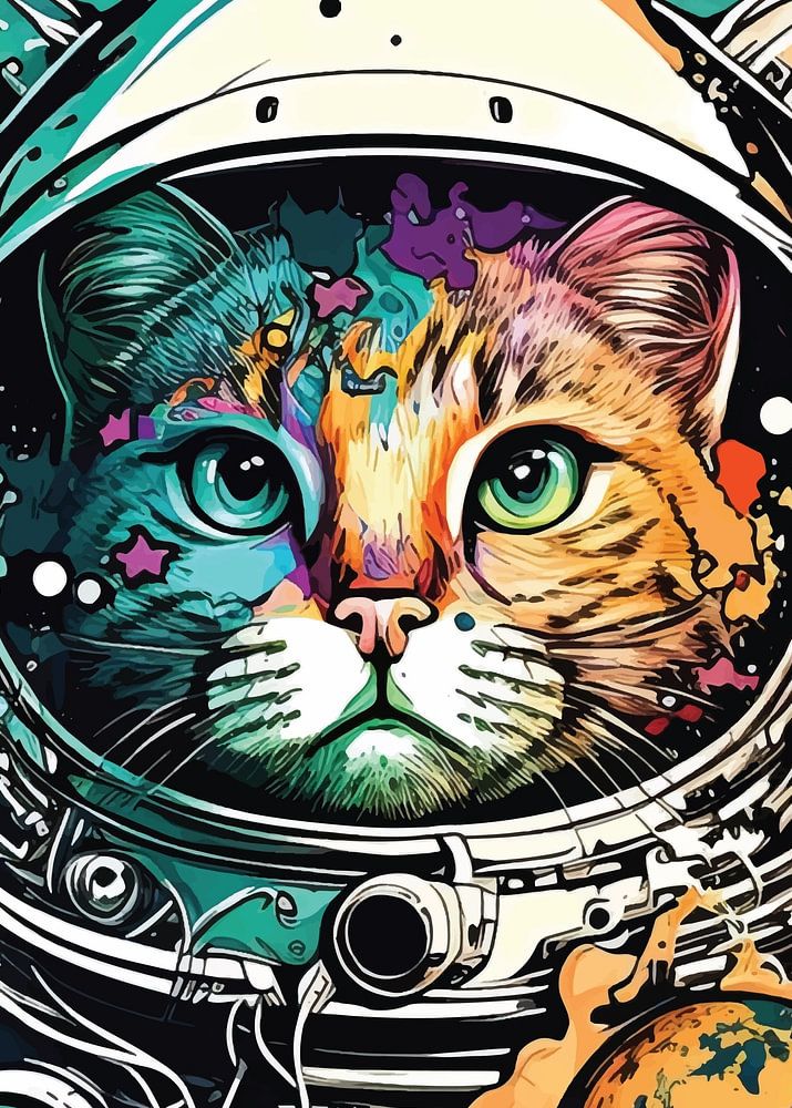 Eine verspielte und farbenfrohe Illustration einer Katze, die einen Astronautenhelm trägt und den Kosmos erkundet. Dieses farbenfrohe Stück ist perfekt, um jedem Raum einen Hauch von Laune zu verleihen.