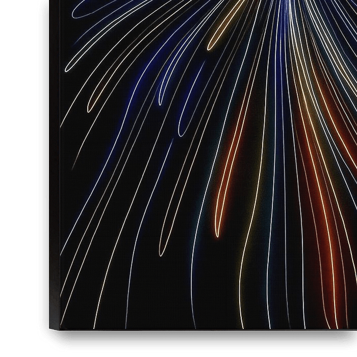 Eine dynamische Explosion aus Farbe und Energie erfüllt die dunkle Leinwand. Helle Lichtstrahlen in Blau, Gelb, Orange und Weiß schießen von einem intensiven Mittelpunkt nach außen, als würde ein Feuerwerk oder ein abstraktes kosmisches Ereignis in einem einzigen kraftvollen Moment festgehalten. Die geschwungenen Linien vermitteln ein…