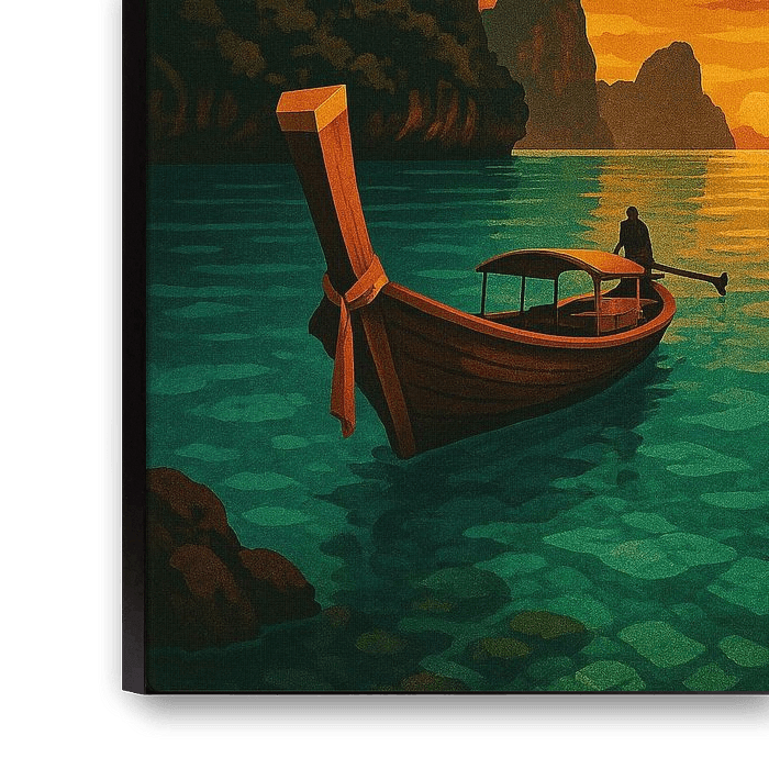 Dieses Kunstwerk fängt die weltberühmte Atmosphäre des Sonnenuntergangs in Krabi ein - eine Mischung aus warmen Goldtönen, tiefen Orangetönen und smaragdgrünem Wasser, die den Küstenzauber Südthailands ausmachen. Zwei traditionelle Longtailboote treiben friedlich auf dem ruhigen Meer, verankert zwischen hoch aufragenden Kalksteinformationen, die sich wie uralte Wächter zu beiden Seiten erheben. Die Sonne sinkt tief über den Horizont und wirft schimmernde Reflexe auf das Wasser.