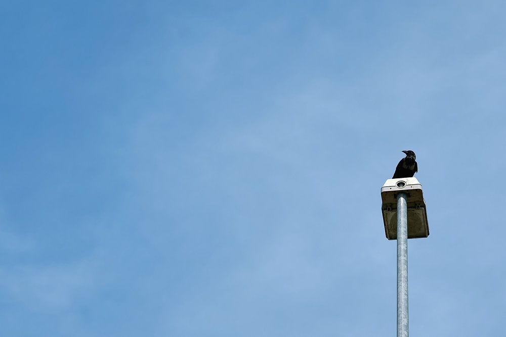 einzelne Krähe auf einer Straßenlaterne in der Innenstadt von Magdeburg in Deutschland. Dieses Bild wirkt auf Grund des geringen Inhalts sehr minimalistisch, was ich sehr gut finde, denn der Betrachter wird durch nichts weiter abgelenkt, sondern der Blick geht direkt auf die Laterne mit der darauf sitzenden Krähe.