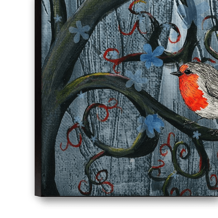 Bestelle dieses Blumen-Wandbild Kräuselbaum mit blauen Blüten und Rotkehlchen von Bianca Wisseloo als Reproduktion auf Leinwand, Alu-Dibond, als Poster, Fototapete oder Acrylglasbild.