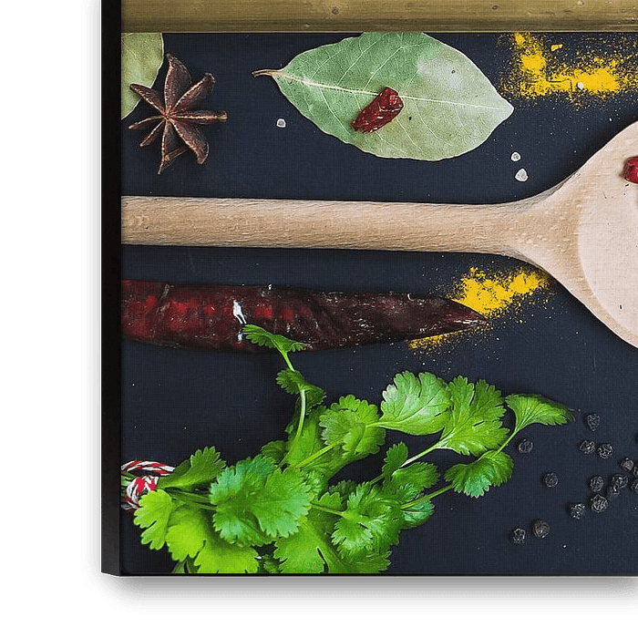 Eine farbenfrohe Kräuterpalette auf Kellen und Kupferlöffeln. Mit frischem Koriander, spanischen Chilischoten, Sternanis, Lorbeerblatt und Zimtstangen