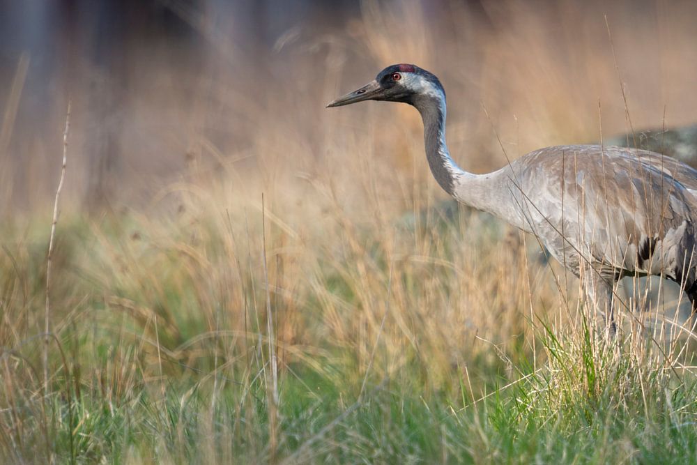 Kranich ( Grus grus ) in Schweden, Altvogel zur Brutzeit im Prachtkleid, sucht in natürlichem Umfeld nach Nahrung, tolles Licht, im Hintergund ein typisches schwedisches Haus, Schweden, Skanidinavien