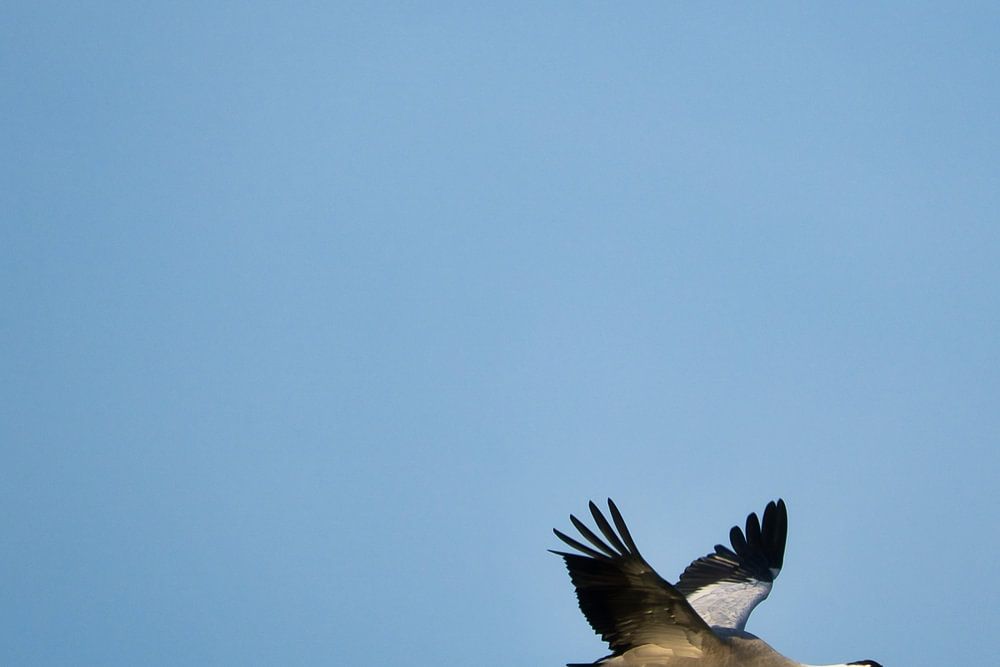 Kraniche fliegen am Himmel. Tierfoto von Zugvögeln.