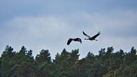 Bestelle dieses Landschafts-Wandbild Kraniche fliegen über einen Wald von Martin Köbsch als Kunstdruck auf Leinwand, Alu-Dibond, als Poster, Fototapete oder Acrylglasbild.