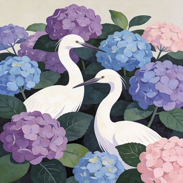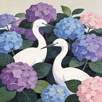 Bestelle dieses Blumen-Wandbild Kraniche im Garten von FRESH Fine Art als Reproduktion auf Leinwand, Alu-Dibond, als Poster, Fototapete oder Acrylglasbild.