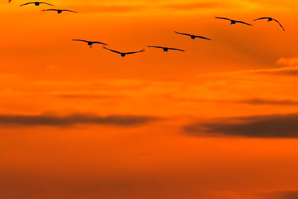 Kraniche oder Eurasische Kraniche (Grus Grus) fliegen während des Herbstzuges in der Nähe von Diepholz in Deutschland durch die Luft. Jeden Herbst versammeln sich Tausende von Kranichen während ihres Zuges von Nordeuropa in die südlichen Winterquartiere in der Nähe von Diepholz, Deutschland. Sie rasten und fressen in den Feuchtgebieten und Feldern der Region und bieten ein spektakuläres Naturschauspiel. Ihre Rufe hallen durch die Landschaft, während sie sich auf die lange Reise in den Süden vorbereiten.
