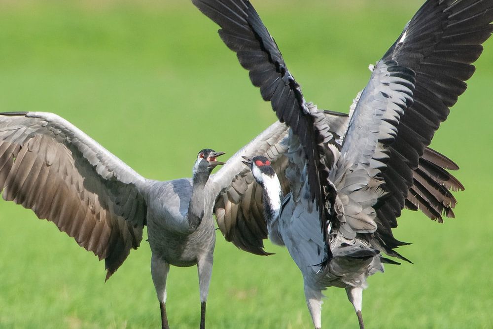 Zwei Kraniche streiten sich auf einem Feld während des Herbstzuges in den Mooren bei Diepholz in Deutschland. Die Kraniche fressen und rasten in den Feldern rund um die niedersächsischen Moore während ihres Zuges von den Brutgebieten in Norddeutschland, Polen und Skandinavien zu ihren Winterquartieren in Spanien und Nordafrika.
