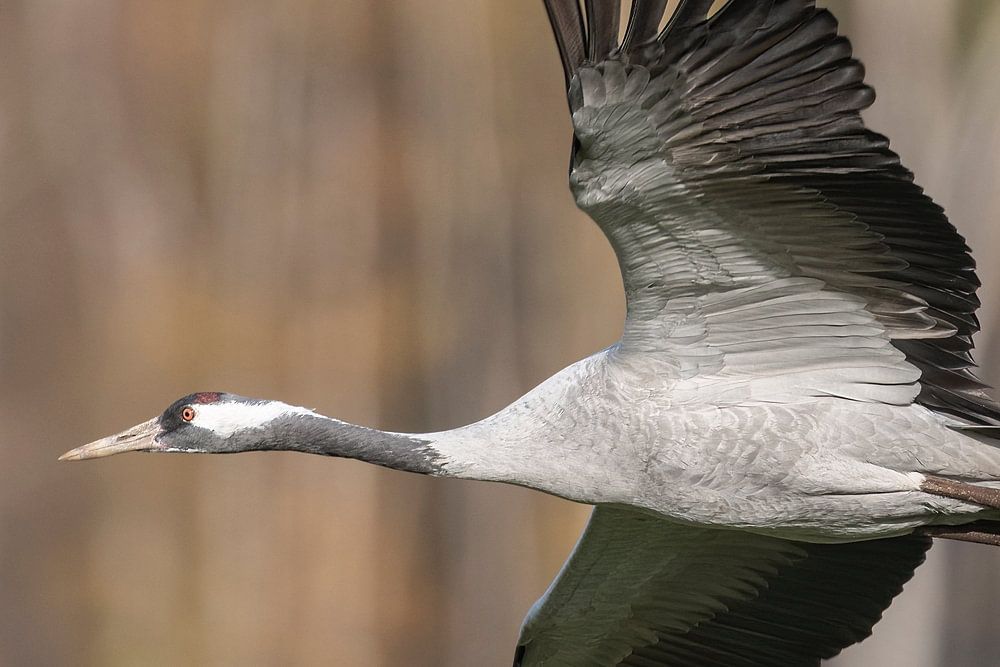 Kranichvogel oder Kranich (Grus Grus) beim Flug über ein Feld mit einem Birkenwald im Hintergrund während des Herbstzuges in den Mooren von Diepholz in Deutschland.