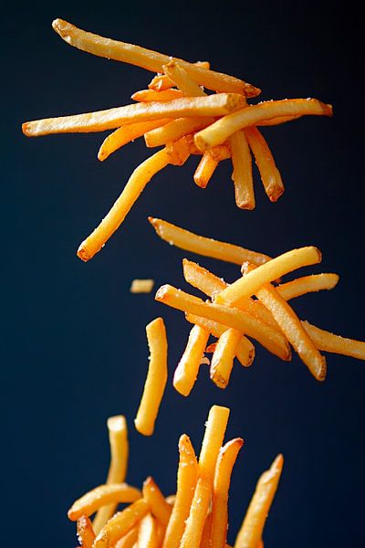 Bestelle das Foto Kreative Pommes Frites in der Luft – Genussmomente von Poster Art Shop als Reproduktion auf Leinwand, Alu-Dibond, als Poster, Fototapete oder Acrylglasbild.