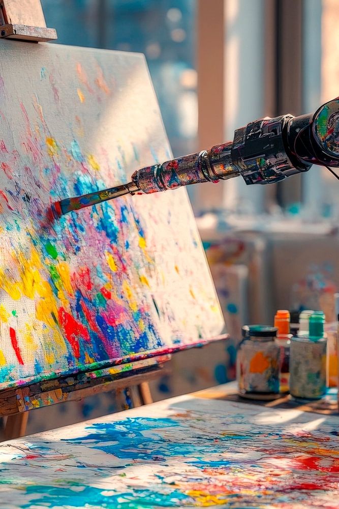 Ein Spiel aus Farben und Formen entfaltet sich, während ein kreativer Roboterarm mit erstaunlicher Präzision Pinselstriche vollbringt. Die warme Lichtstimmung der Umgebung verleiht dem Setting eine inspirierende Atmosphäre, die perfekt für ein Arbeitszimmer oder Atelier ist. Hier trifft Technik auf Kunst, und jeder Blick auf die Leinwand lädt zur Entfaltung der eigenen Kreativität ein.
