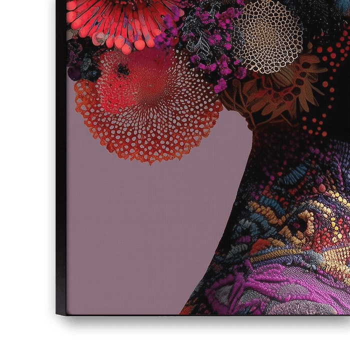 Das Profil einer Person, raffiniert und ruhig, aus dem eine Fülle von Blumen und Mustern erblüht. Das Werk zelebriert Kreativität und Fantasie, als würden die Gedanken in Farbe lebendig werden.