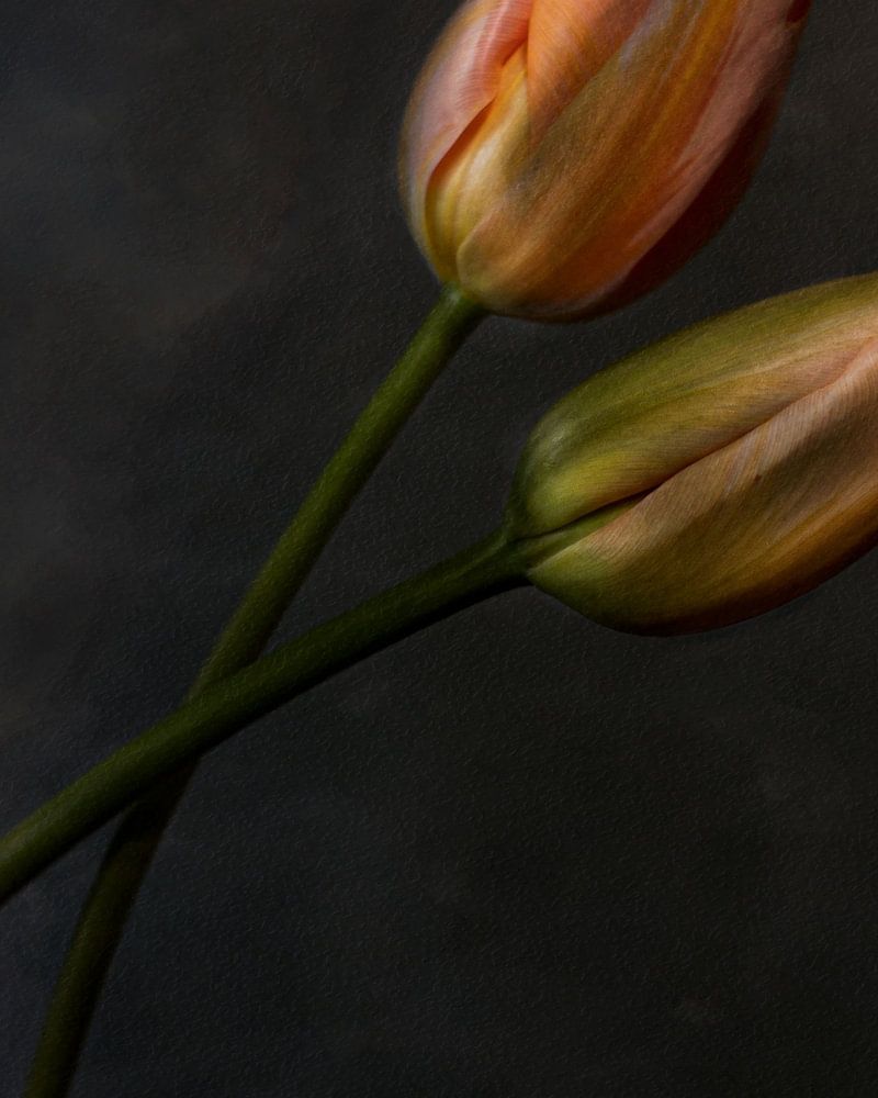 Eines Tages werden sich unsere Wege wieder kreuzen. Die beiden Tulpen kreuzen sich, ganz im Stil der alten Meister. Das Orange kontrastiert wunderbar mit dem dramatischen schwarzen Hintergrund.
