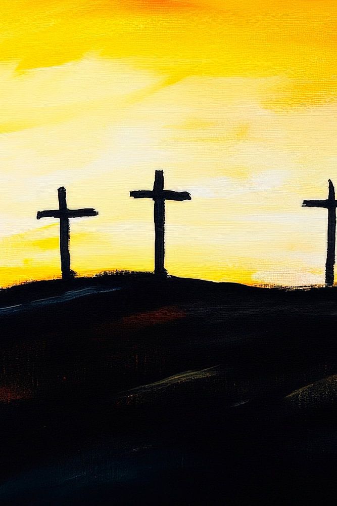 Inmitten eines dramatischen Sonnenuntergangs erheben sich drei Kreuzsilhouetten majestätisch gegen ein leuchtendes, warmes Farbenspiel aus Orange und Gelb. Diese kraftvolle Darstellung strahlt eine tiefe Spiritualität aus und schafft eine nachdenkliche Atmosphäre. Ideal für das Wohnzimmer oder einen Meditationsraum, lädt das Bild zum Innehalten und Reflektieren ein.