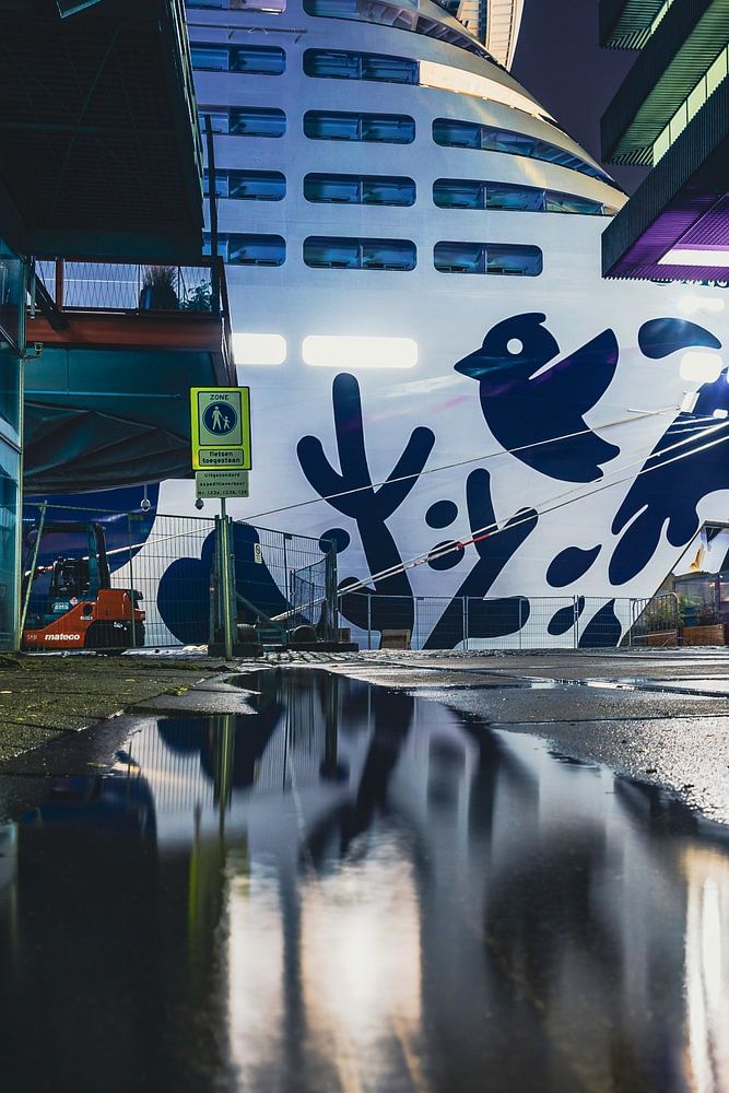 Dieses Foto habe ich am 2. Januar aufgenommen, als neben dem Sturm Hans auch die majestätische Euribia am Kreuzfahrtterminal am Wilhelmina Pier festgemacht hat. Eine Herausforderung, bei der ich auf meinen Knien sitzend ein vertikales Panorama aufnahm, um das große Schiff darauf zu bekommen.