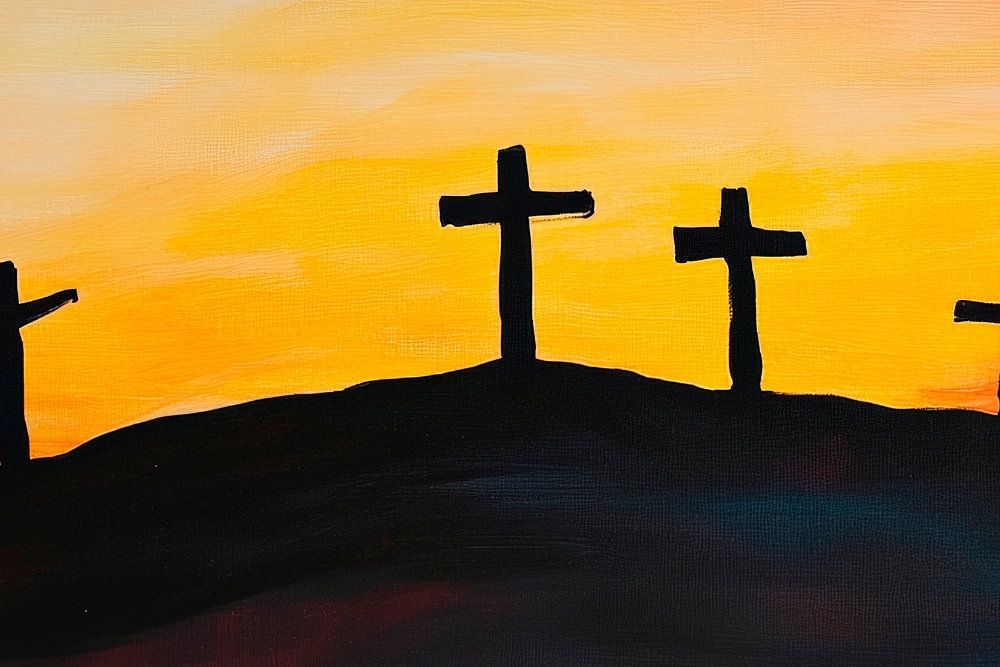 In sanften Farben verschmelzen Himmel und Erde, während vier Silhouetten von Kreuzen vor einem atemberaubenden Sonnenuntergang stehen. Diese harmonische Szene strahlt Ruhe und Spiritualität aus und schafft eine besinnliche Atmosphäre. Ideal für das Wohnzimmer, wo sie Tiefe und nachdenkliche Gespräche anregen kann.