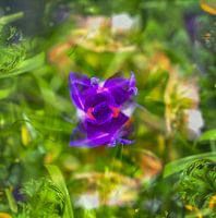 Eine schöne Kreation, die die Fantasie anregt. Die Farbnuancen, tiefes Blau bis hin zu Violett und Gelb auf grünem Hintergrund. Indem man die Krokusse in verschiedenen Positionen auf demselben Bild fotografiert, erhält man eine fantasievolle Darstellung von drei Krokussen auf einem Bild.