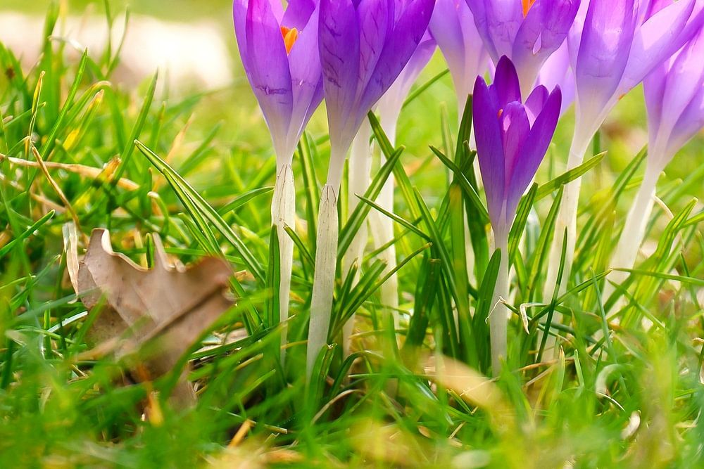 Krokus auf einer Wiese vom Sonnenlicht angestrahlt. Filigrane Blume, im detailliert