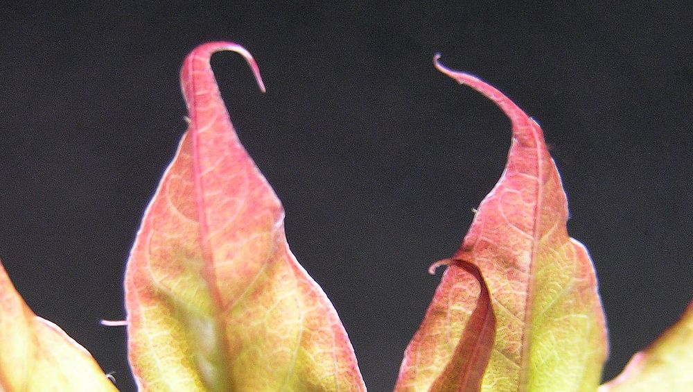 Een jong blad met gekleurde bladpunten in tegenlicht. Groen met rode kleur.