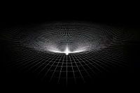 Ein feinmaschiges, perspektivisch verzerrtes Gitternetz senkt sich trichterförmig in ein hell leuchtendes Zentrum ab. Die Linien strahlen konzentrisch nach außen und erzeugen den Eindruck eines gekrümmten Raums, fast wie ein visueller Sog. Der starke Kontrast zwischen dem schwarzen Hintergrund und dem weißen Lichtpunkt verstärkt die…