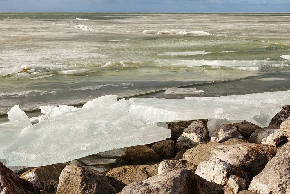 Kruiend ijs op het Markermeer onder een heldere lucht