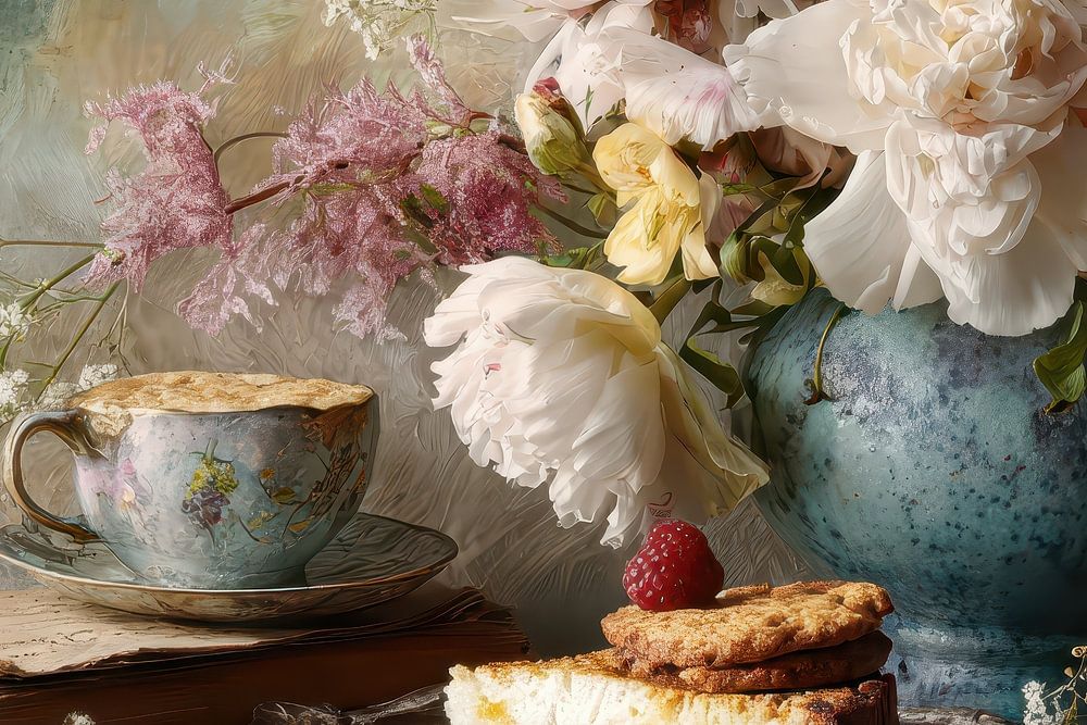 Ein raffiniertes Stillleben mit einem Teller mit einem Stück Kuchen, frischen Himbeeren, knusprigen Keksen und einem klassischen Buch mit einer Tasse Kaffee oder Tee darauf. Eine elegante Vase mit einem reichen Blumenstrauß, darunter üppige Pfingstrosen, strahlt Luxus und Romantik aus.