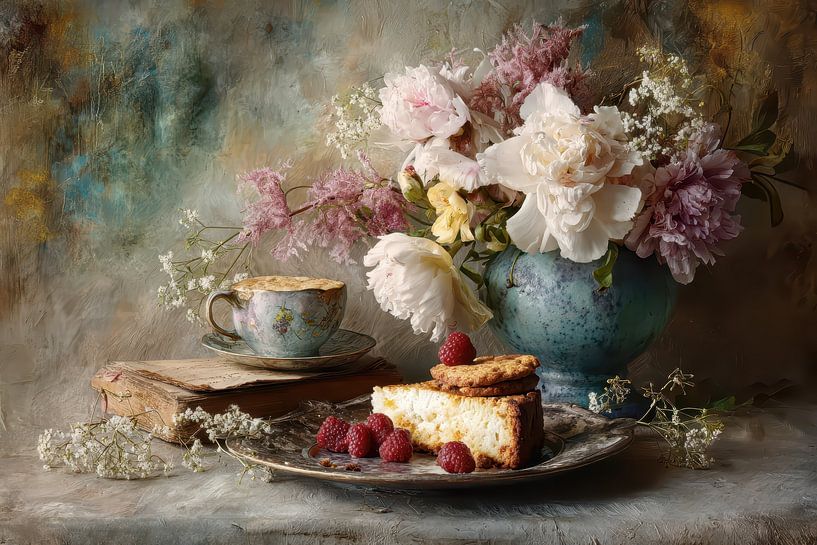 Ein raffiniertes Stillleben mit einem Teller mit einem Stück Kuchen, frischen Himbeeren, knusprigen Keksen und einem klassischen Buch mit einer Tasse Kaffee oder Tee darauf. Eine elegante Vase mit einem reichen Blumenstrauß, darunter üppige Pfingstrosen, strahlt Luxus und Romantik aus.