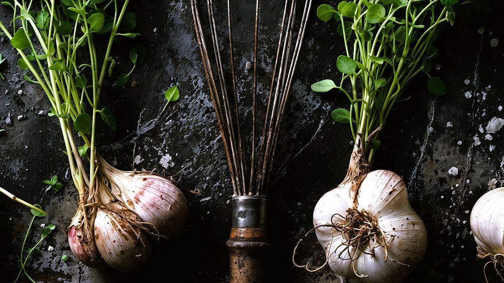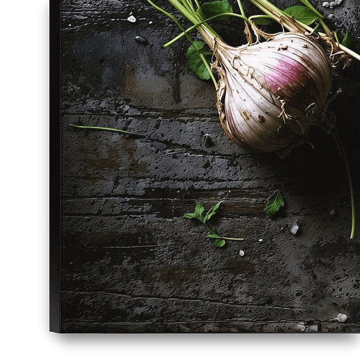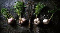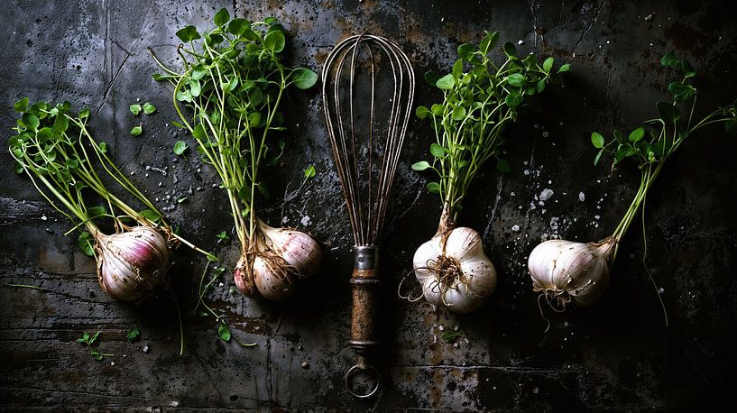 Rustikales Food-Stillleben auf dunklem Stein-Hintergrund. Zu sehen sind vier frische Knollen mit langen, grünen Kräuterstielen und ein antiker, patinierter Schneebesen in der Mitte. Grobe Salzstreusel und erdige Texturen verleihen dem Bild einen modernen Fine-Art-Look im Industrial-Stil. Perfekt als Wandbild für Küche oder Restaurant.