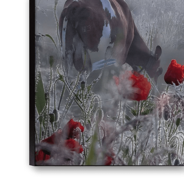 Kühe im Polder im Nebel mit glücklichen Mohnblumen im Vordergrund.