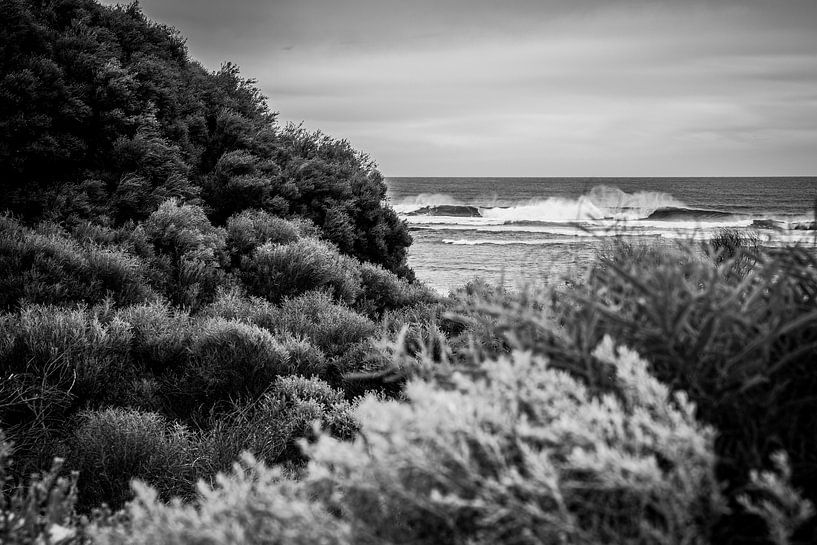 In dieser Schwarz-Weiß-Aufnahme der westaustralischen Küste reduziert sich die Landschaft auf ihre wesentlichen Formen und Strukturen. Im Vordergrund ziehen sich die Büsche als helle und dunkle Flächen nach links ansteigend durch das Bild und erzeugen eine klare Linienführung. Rechts im Mittelgrund öffnet sich der Blick auf die…