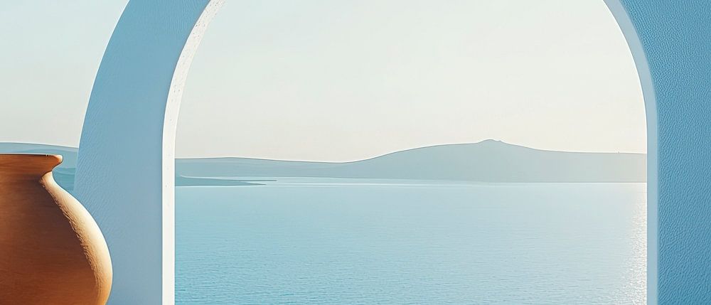 Ein sanfter Lichtstrahl fließt durch einen eleganten Bogen und öffnet den Blick auf das glitzernde Wasser. Die erdige Tonvase, harmonisch platziert, ergänzt die luftige Leichtigkeit der Szenerie. Ideal für das Wohnzimmer, schafft dieses Bild eine entspannende Atmosphäre, die zum Träumen und Verweilen einlädt.