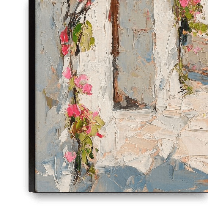Ein idyllischer Ausblick auf ein mediterranes Paradies entfaltet sich, wo leuchtende Bougainvillea in sattem Pink die strahlend weißen Wände zieren. Der sanfte Wind streichelt die Wellen des tiefblauen Meeres, während die Sonne die Wolken sanft umspielt. Hier, zwischen Tradition und Natur, vereint sich die Magie eines unvergesslichen…