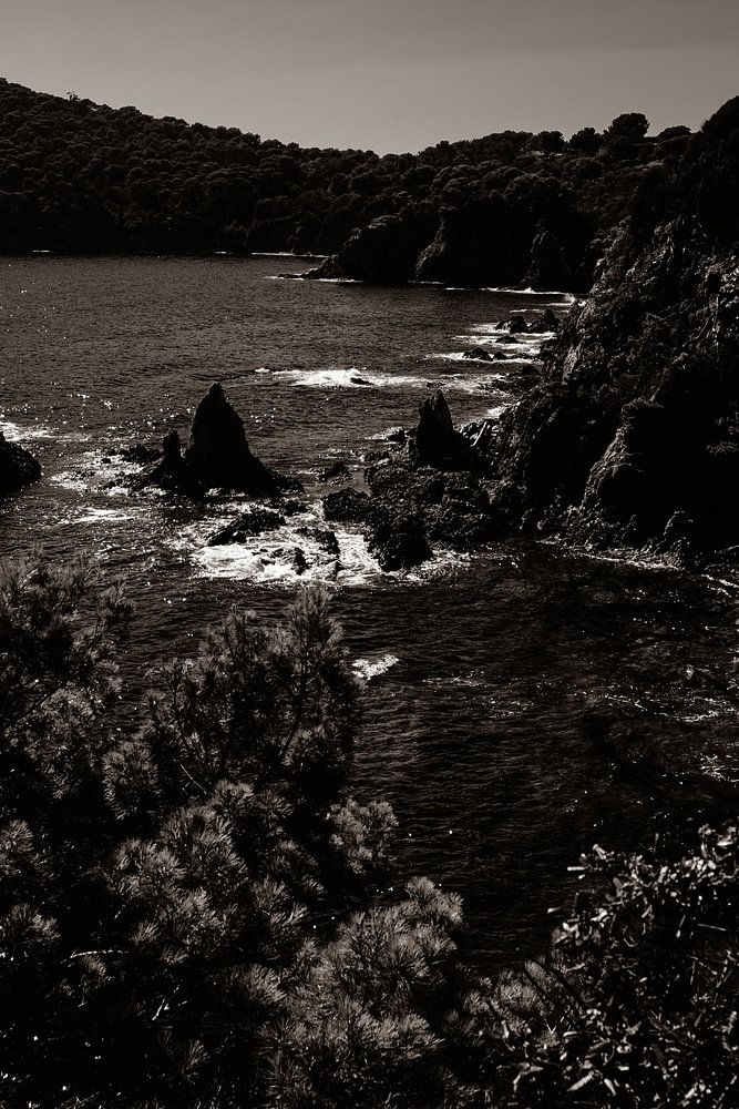 Küstenlandschaft mit klarem Himmel, Bergen, Bäumen und einem ruhigen Strand an der Côte d' Azur im Sommer in Sepia.