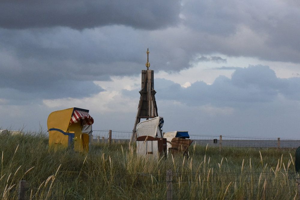 Das Bild der Kugelbake Cuxhaven zeigt die Bake friesisch herb aus ungewöhnlicher Perspektive mit ungewöhnlich wenig Wasser bei typischem Wolkenspiel.